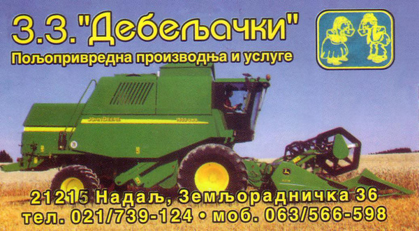 ZZ ''DEBELJAČKI'' 21216 Nadalj - Zemljoradnička 36![]() Tel.-Fax.: 021-739-124 Mob.: 063-566-598 - Vladimir Mob.: 063-517-190 - Ljubica E-mail: zzdebeljacki@teamnet.ws Web: www.zzdebeljacki.backabanat.com Delatnost: - Ugovaranje poljoprivredne proizvodnje, - Otkup i prodaja poljoprivrednih proizvoda, - Kompletna usluga obrade zemljišta. |